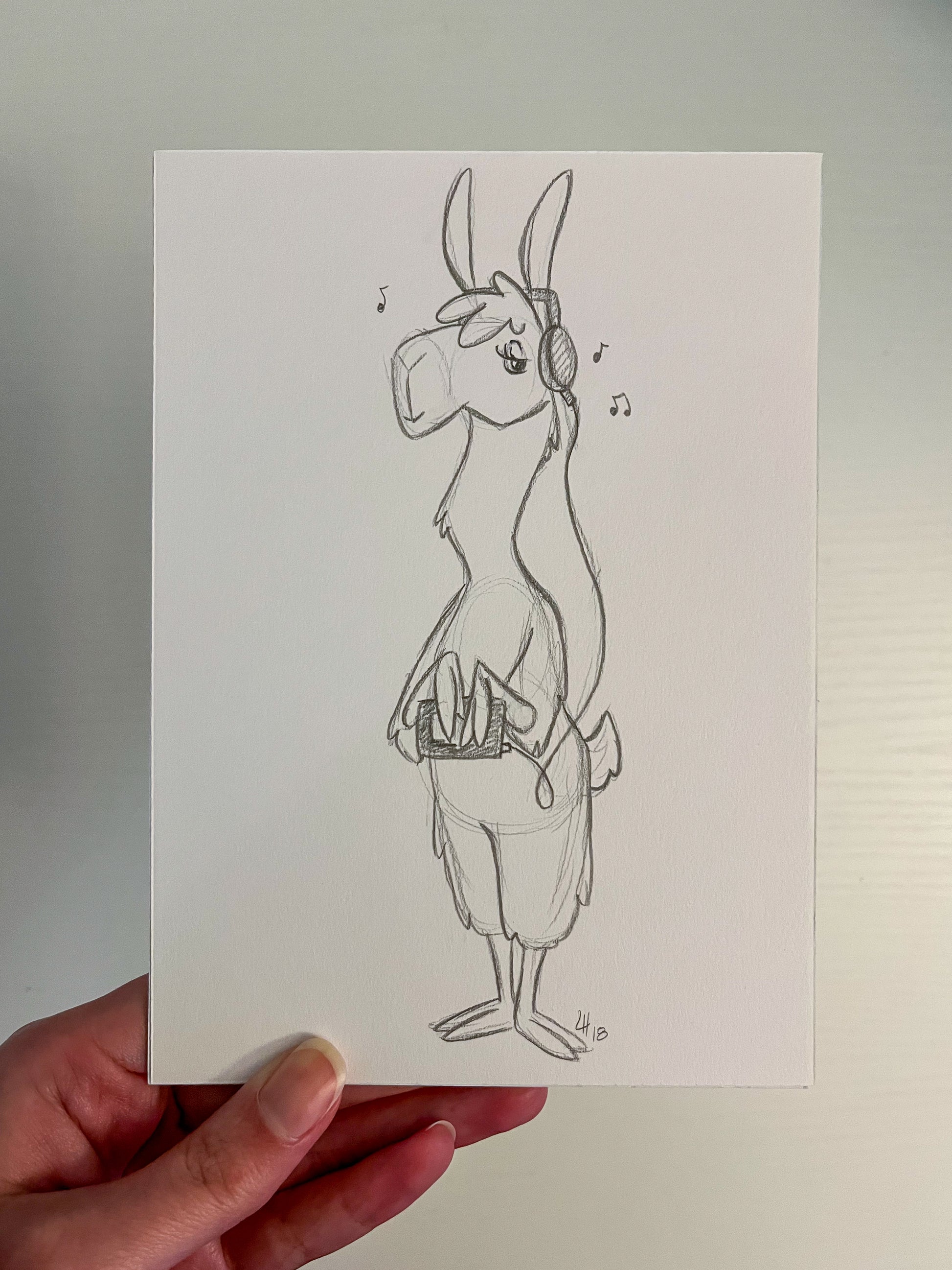 Original sketch and page from my sketchbook of a llama groovin to some tunes