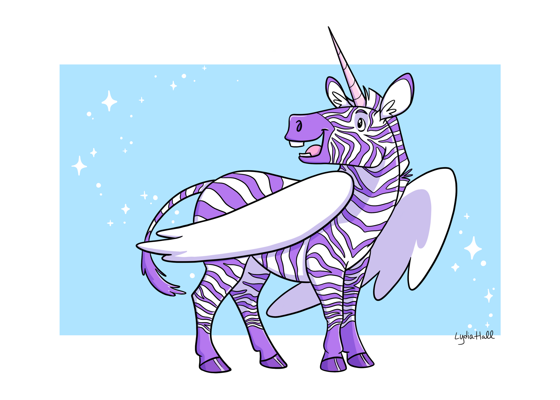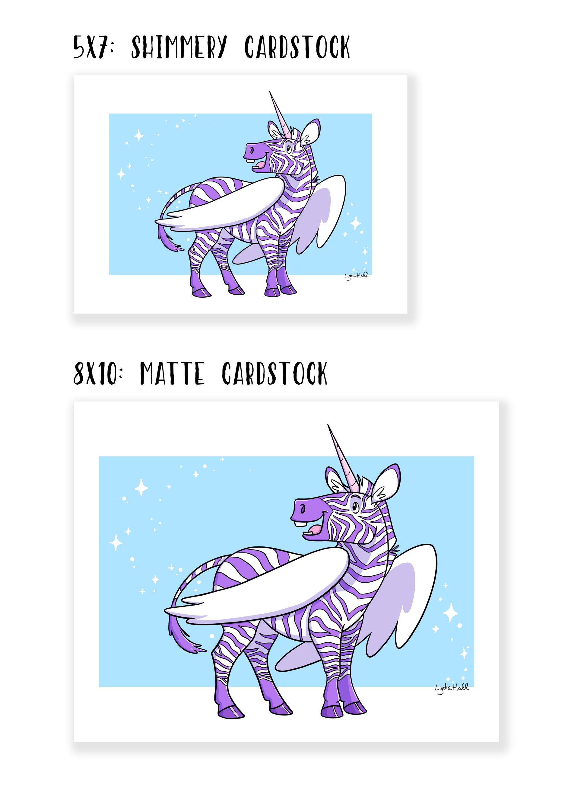 Art prints featuring my zebra unicorn illustration. Comes in multiple sizes.
